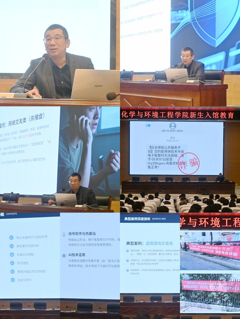 随后,保卫处副处长蔡汉亭老师为同学们带来了安全教育专题讲座。蔡处长结合多年工作经验,通过真实案例剖析,深入浅出地介绍了当前常见的电信网络诈骗手段及防范措施。他强调,大学生群体是诈骗分子的重点目标,提醒同学们务必增强防范意识,提高安全能力,保护好个人信息与财产安全。